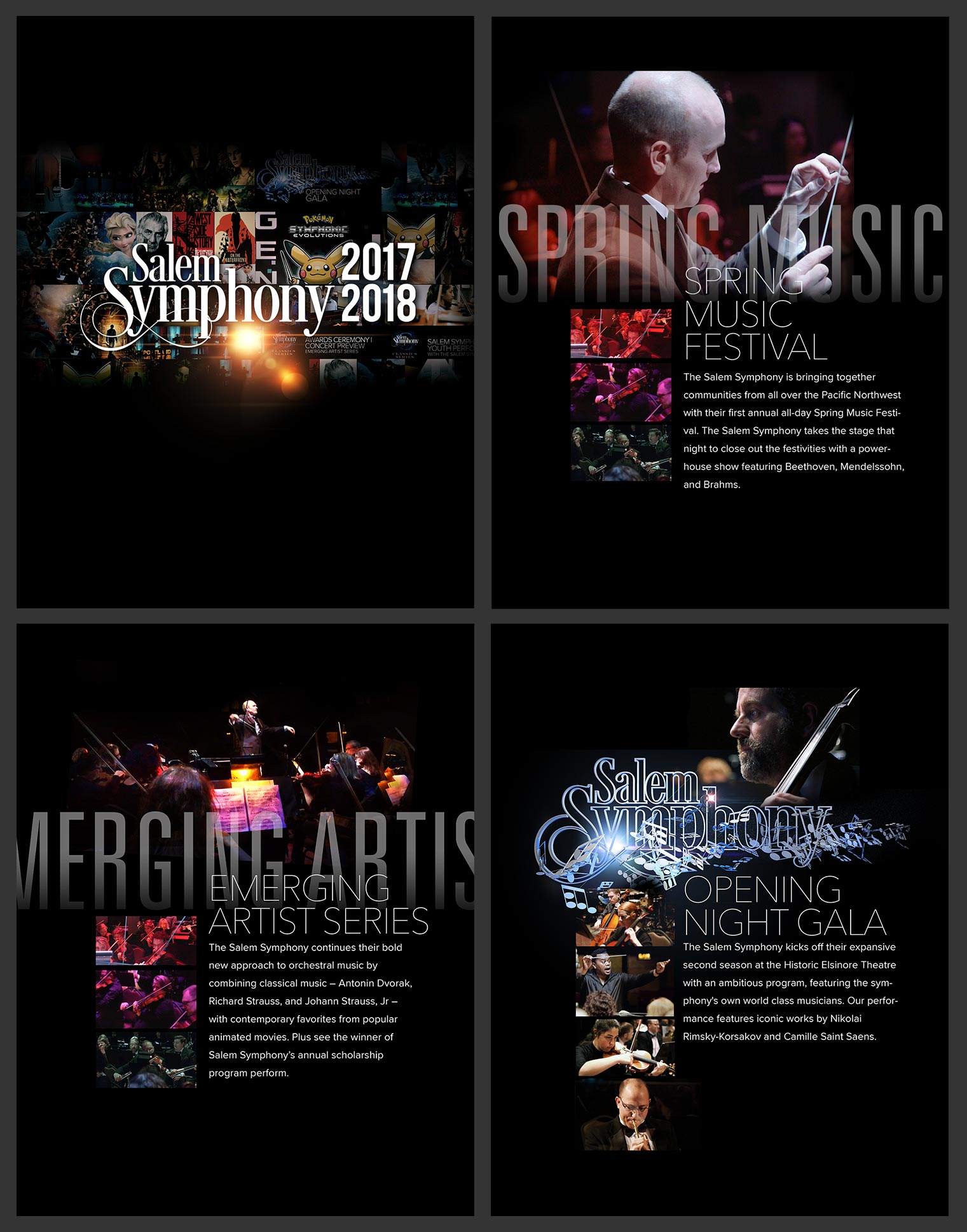 The Salem Symphony brought us on board to design its brand work and marketing beginning in 2016 starting with a small auditions-only website. Throughout the campaign, we designed their logo; crafted their brand look; designed, wrote, and stocked their consumer website with content; created sponsorship outreach printed and digital media; produced several films; and conducted their advertising and digital promotion.