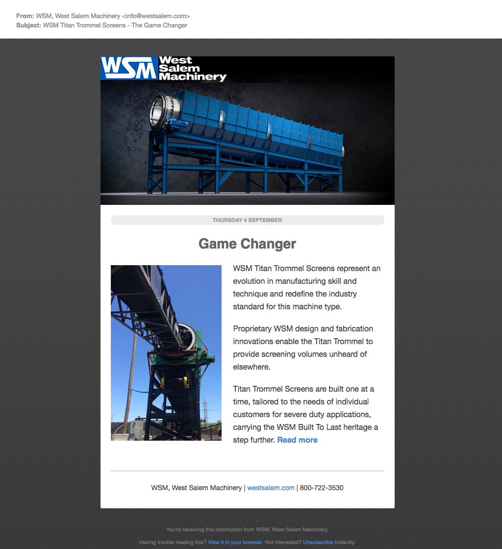 West Salem Machinery designs and manufactures heavy recycling machinery and systems sold throughout the world. We reworked their entire brand look and marketing from their website, print, brand films, photography, and email/landing page campaigns.